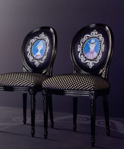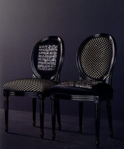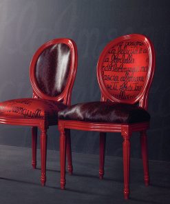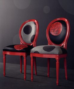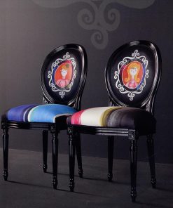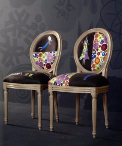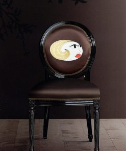 Стул, декорирован резьбой. Наполнение — полиуретан. Ткань расписана вручную. Возможны различные варианты отделки и обивки, в том числе выполнение в ткани клиента.