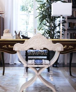 Стул, в комплекте с подушкой для сидения. Декорирован резными элементами ручной работы. Наполнение — полиуретан. Возможны различные варианты обивки и отделки.
