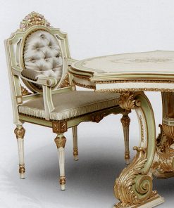 Стул с обитыми подлокотниками и сидением. Спинка обита в технике капитоне. Декорирован резьбой. Возможны другие варианты отделки и обивки.
