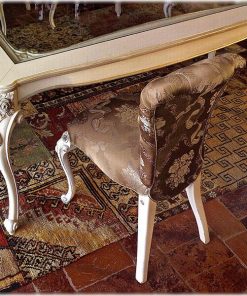 Стул с подлокотниками (возможен вариант стула без подлокотников), мягкие сидение, спинка и подлокотники. Наполнение — полиуретан. Ножки декорированы резными элементами. Возможны другие варианты отделки и обивки.