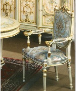 Стул с подлокотниками, мягкие сидение и спинка, подлокотники с мягкими накладками. Наполнение — полиуретан. Декорирован резными элементами. Возможны другие варианты отделки и обивки.