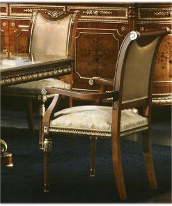 Стул с подлокотниками, мягкие сидение и спинка, жесткие подлокотники. Возможен вариант стула без подлокотников. Наполнение — полиуретан. Декорирован резными элементами. Возможны другие варианты отделки и обивки.