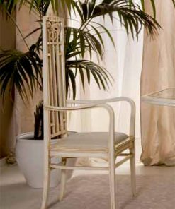 Стул с подлокотниками, мягкое сидение, жесткая высокая спинка. Наполнение — полиуретан. Возможны другие варианты отделки и обивки.