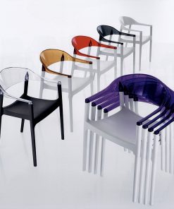 Стул. Структура — полипропилен, поликарбонат. Возможны различные цветовые отделки спинки — красный, фиолетовый, охра, прозрачный. Минимальный заказ 4 стула.