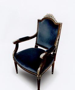 Стул с обитыми подлокотниками, сидением и спинкой. Декорирован резьбой. Возможны другие варианты отделки и обивки.