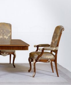 Стул с обитыми подлокотниками, сидением и спинкой. Декорирован резьбой. Возможны другие варианты отделки и обивки, в том числе в ткани клиента.