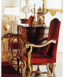 Стул с подлокотниками, мягкие сиденье и спинка. Декорирован резьбой. Наполнение — полиуретан. Возможны различные варианты обивки.