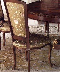 Стул с обитым сидением и спинкой. Украшен резьбой. Возможны другие варианты отделки и обивки.