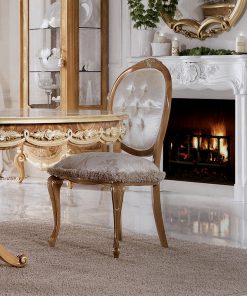 Стул с обитым мягким сидением. Спинка обита в технике капитоне. Декорирован резьбой. Возможны другие варианты отделки и обивки.