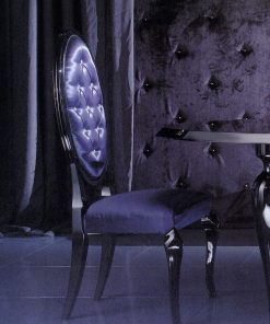 Стул с высокой спинкой. Структура — бук, наполнение — полиуретан. Возможны другие варианты отделки и обивки, в том числе выполнение в ткани клиента. Возможна отделка капитоне со стразами Сваровски. Возможен заказ только четного количества стульев