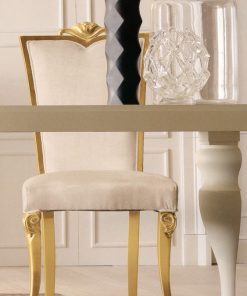 Стул, мягкие сидение и спинка, декорирован резными элементами. Наполнение — полиуретан. Возможны другие варианты отделки и обивки.