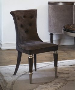 Стул с металлическим каркасом, мягким сиденьем и спинкой, обитой в технике капитоне. Задние ножки выполнены из дерева и обиты кожей. Передние ножки выполнены из металла и декорированы вставками из оникса. Возможен вариант вставок из мрамора или кожи в цвет основания. Возможны друге варианты отделки и обивки. Дополнительно можно декорировать пуговицы кристаллами Swarovski