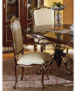 Стул, возможен вариант с подлокотниками. Мягкие сиденье и спинка. Наполнение — полиуретан. Декорирован резьбой. Ручная работа. Возможны различные варианты отделки (красное дерево, махагон, охра, декапе и т.д.) и обивки.