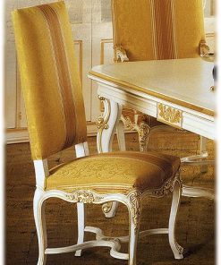 Стул c высокой спинкой, возможен вариант с подлокотниками. Мягкие сиденье и спинка. Наполнение — полиуретан. Декорирован резьбой. Ручная работа. Возможны различные варианты отделки (красное дерево, махагон, охра, декапе и т.д.) и обивки.