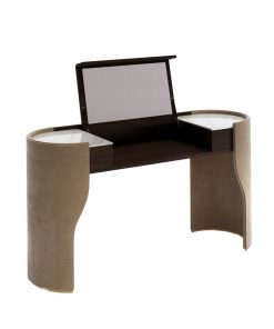 Туалетный столик c откидной столешницей. Центральная открывающаяся часть оснащена внутренним зеркалом. Боковые части столешницы выполнены из мрамора. Фигурный каркас с металлическим основанием обтянут кожей. Возможны другие варианты отделки и обивки