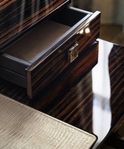 Туалетный столик с тремя выдвижными ящиками, мраморными ручками и поворотным настольным зеркалом. Основание выполнено из металла. Столешница и внутренняя поверхность ящиков обтянуты кожей. Возможны другие варианты отделки. Зеркало можно заказать отдельно