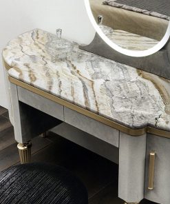 Туалетный столик с двумя выдвижными ящиками, двумя распашными дверцами и зеркалом. Ножки выполнены из металла, фигурная столешница выполнена из мрамора. Зеркало обрамлено рамой со светодиодным освещением. Возможен вариант с кожаной столешницей. Возможны другие варианты отделки