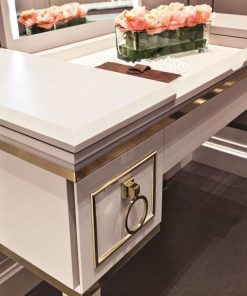 Туалетный столик с тремя выдвижными ящиками и откидной столешницей с внутренним зеркалом. Оснащён подсвткой. Декорирован металлическими вставками. Возможны другие варианты отделки