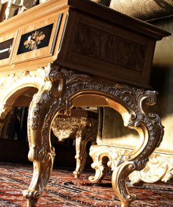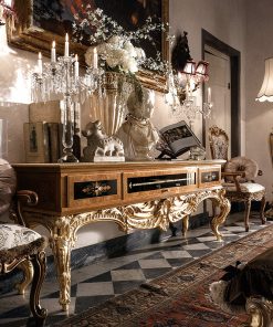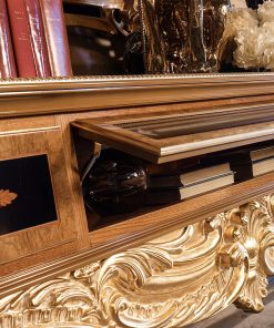 Тумба под TV с двумя выдвижными ящиками, откидной стеклянной дверцей и фигурным основанием с изогнутыми ножками. Декорирована инкрустацией и резьбой. Поверхность столешницы оснащена двумя фигурными вставками из стекла. Возможны другие варианты отделки
