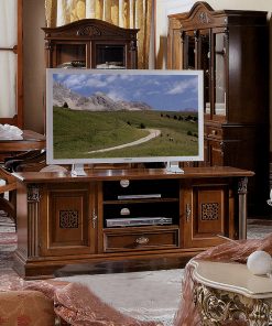 Тумба под TV с открытой полкой, выдвижным ящиком и 2 распашными дверцами. Декорирована резьбой. Возможны другие варианты отделки.