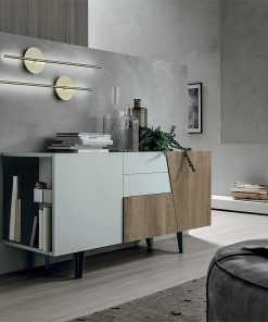 Тумба под TV с металлическими ножками, 2 распашными дверцами, 3 выдвижными ящиками и открытыми полками по бокам. Возможен вариант с металлической или керамической столешницей и другие варианты отделки.