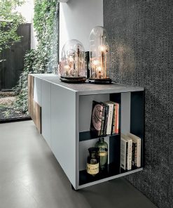 Тумба под TV с металлическими ножками, 3 распашными дверцами, 3 выдвижными ящиками и открытыми полками по бокам. Возможен вариант с металлической или керамической столешницей и другие варианты отделки.
