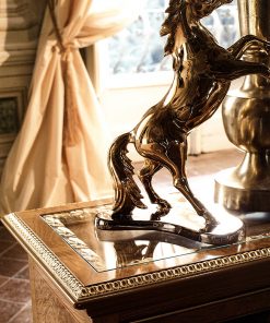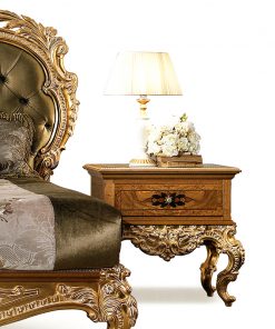 Прикроватная тумбочка с выдвижным ящиком и столешницей со стеклянной поверхностью. Декорирована инкрустацией и резьбой. Возможны другие варианты отделки