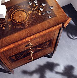 Прикроватная тумбочка с тремя выдвижными ящиками. Украшена инкрустацией. Возможны другие варианты отделки.