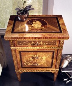 Прикроватная тумбочка с тремя выдвижными ящиками. Украшена инкрустацией. Возможны другие варианты отделки.
