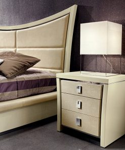 Прикроватная тумбочка с тремя выдвижными обшитыми ящиками с металлическими ручками. Структура с лакированной отделкой и вставками из блестящего хромированного металла. Возможны другие варианты отделки и обивки.