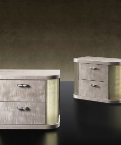Прикроватная тумбочка с двумя выдвижными ящиками. Закруглённые боковины выполнены из рифлёного стекла и декорированы металлическими вставками. Возможны другие варианты отделки. Дополнительно для боковин можно заказать светодиодную подсветку