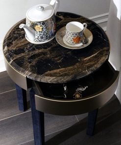 Прикроватная тумбочка с металлической кромкой, выдвижным ящиком и круглой мраморной столешницей. Основание обито кожей. Возможен вариант с деревянным основанием. Столешница может быть стеклянной, деревянной или из крашенного хрусталя. Возможны другие варианты отделки и обивки