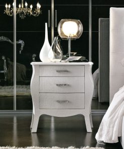 Обитая тумбочка с 3 выдвижными ящиками.. Ручки с кристаллами Swarovski. Возможны другие варианты отделки и ручек, а также можно декорировать фасад кристаллами Swarovski.