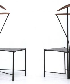 Вешалка с металлическим основанием и сиденьем. Сиденье может быть деревянным или в кожаной обивке
