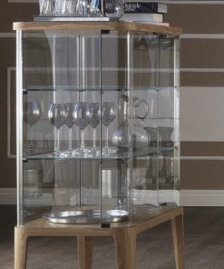 Витрина с деревянным основанием, стеклянным каркасом и двумя распашными дверцами. Оснащена стеклянными полками. Возможен вариант с одной дверцей. Возможны другие варианты отделки