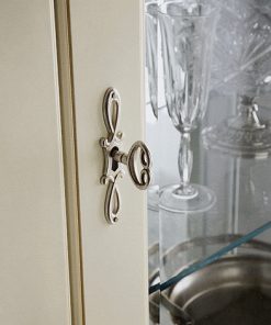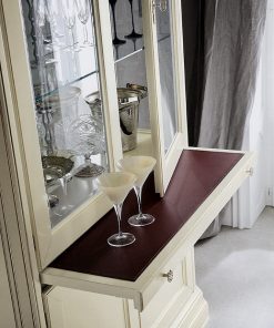 Витрина с обитой выдвижной полкой, 2 деревянными и 2 стеклянными распашными дверцами, с внутренней подсветкой. Полки выполнены из стекла. Декорирована резьбой. Зеркалная задняя стенка может быть обита тканью. Возможны другие варианты отделки.
