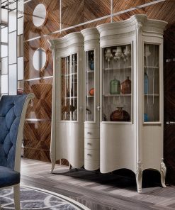 Витрина с 2 стеклянными распашными дверцами и 3 выдвижными ящиками. Декорирован резьбой. Полки выполнены из дерева. Возможны другие варианты отделки.