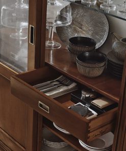 Витрина с 2 стеклянными раздвижными дверцами, с деревянными и стеклянными полками, выдвижными ящиками и тайником. Возможны другие варианты ручек.