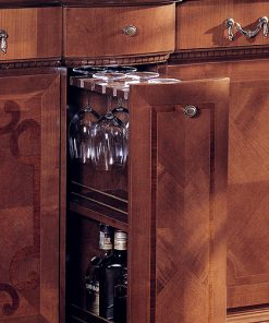 Витрина с распашными дверцами и выдвижными ящиками. Полки выполнены из стекла. Украшена инкрустацией и резьбой. Возможны другие варианты отделки.