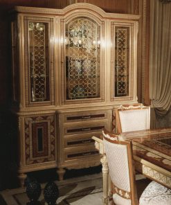 Витрина с четырьмя выдвижными ящиками и пятью распашными дверцами. Внутри оснащена стеклянными полками. Нижние дверцы декорированы инкрустацией, дверцы из стекла декорированы узорами. Возможны другие варианты отделки