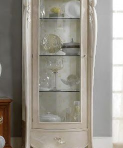Витрина с одной распашной дверцей. Украшена резьбой и росписью. Полки выполнены из стекла. Возможны другие варианты отделки и ручек.