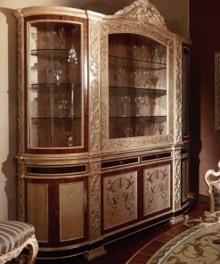 Витрина с шестью распашными дверцами и двумя выдвижными ящиками. Декорирована резьбой и инкрустацией и росписью. Внутри оснащена стеклянными полками. Возможны другие варианты отделки