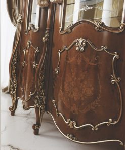 Витрина с тремя распашными стеклянными дверцами. Декорирована росписью и резьбой. Оснащена стеклянными полками
