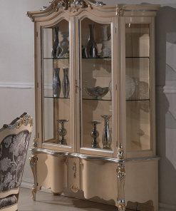Витрина с 2 стеклянными распашными дверцами и 2 выдвижными ящиками. Задняя стенка обита тканью, полки выполнены из стекла. Украшена резьбой. Возможны другие варианты отделки.
