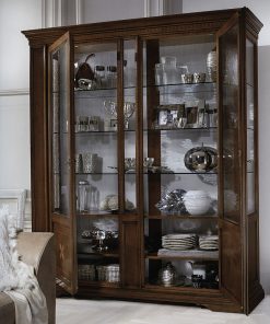 Витрина с 2 стеклянными распашными дверцами. Украшена инкрустацией. Полки выполнены из стекла. Задняя панель обита тканью.