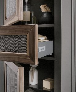 Витрина с обитыми распашными дверцами и выдвижным ящиком. Возможны другие варианты отделки.