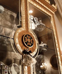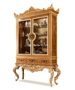 Витрина с двумя распашными стеклянными дверцами, тремя выдвижными ящиками и фигурным основанием с изогнутыми ножками. Декорирована инкрустацией и резьбой. Оснащена тремя стеклянными полками и подсветкой. Возможны другие варианты отделки