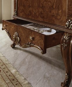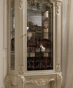 Витрина с 1 стеклянной распашной дверцей и 1 выдвижным ящиком. Декорирована резьбой. Полки выполнены из стекла. Возможны другие варианты отделки.
