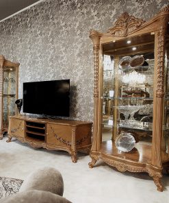 Витрина с подсветкой, стеклянными боковинами, задней стенкой, полками и распашной дверцей. Декорирована резьбой. Возможны другие варианты отделки.