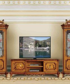 Витрина со стеклянной распашной дверцей на замке и зеркальной задней стенкой. Полки выполнены из стекла. Декорирована инкрустацией и резьбой. Возможны другие варианты отделки.